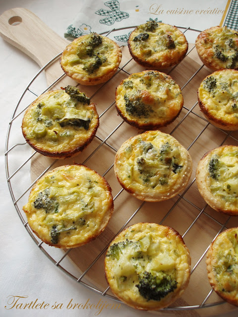 Razvijte tanko testo između dva lista papira za pečenje. Okruglom modlicom ili većom čašom izvadite krugove i utisnite u kalup za mafine (ne morate premazivati). U svaku korpicu stavite po nekoliko cvetića brokolija i prelijte pripremljenim umakom. Stavite u zagrejanu rernu i pecite na 200 C oko 25-30 minuta. Gotove tartlete poslužite tople kao laku užinu ili večeru... prijatno!:)
