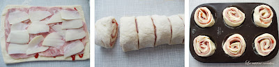 Za slane pužiće testo razvijte u pravougaonu koru i premažite sa malo sosa od paradajza (može staviti i ajvar, kečap i dr.). Preko toga stavite nekoliko šnitica šunke i listiće kačkavalja (možete ga i narendati). Pospite origanom i sve zamotajte u rolat. Isecite na šnite širine 2-3 cm i poređajte ih u podmazan kalup za mafine. Pecite na 200 C oko 30 minuta i poslužite dok su fino tople. Prijatno grickanje!:)