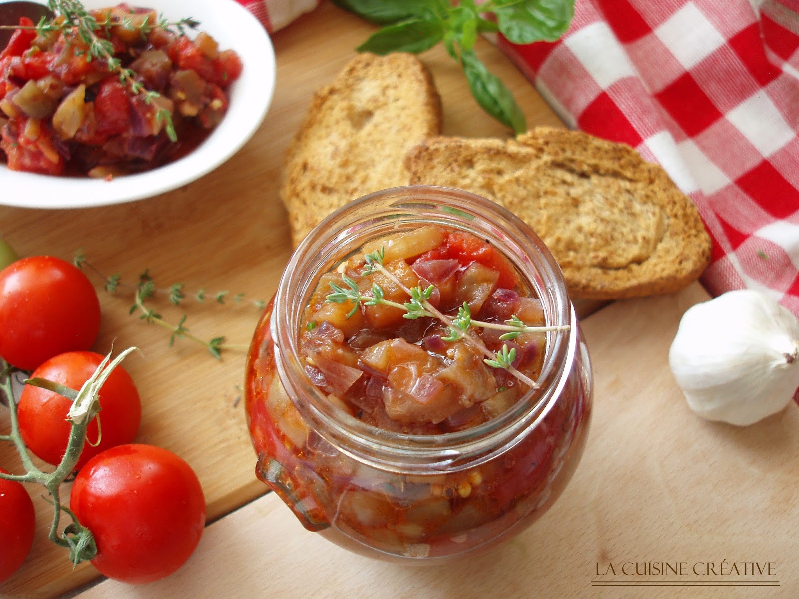 Sastojci: 1,5 kg oljuštenog paradajza, 500 g patlidžana, 2 čena belog luka, 1 čili papričica, 2 ljubičasta luka, 3 zelene jabuke, 1 kašičica slačice u zrnu, 1 kašičica semenki komorača, 1 kašičica kima, vezica timijana, 1 manja šoljica ulja, vinsko sirće i šećer (najbolje po ukusu, u originalu ide po 1 šolja), so po ukusu