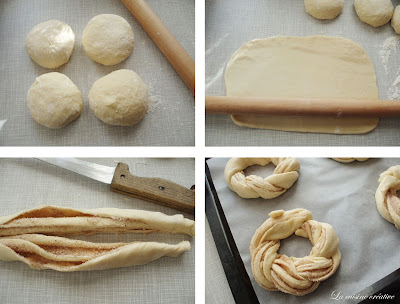 Nakon odmaranja, testo podeliti na 4 dela i oblikovati loptice. Svaku lopticu rastanjiti u pravougaonu koru i premazati maslacem sobne temperature . Pomešati kristal šećer sa cimetom i obilno posuti svaku koru (pazite da imate dovoljno fila za sve 4 kore). Koru zaviti u rolat i oštrim nožem raseći po dužini, pa zatim uplesti kao pletenicu i skupiti krajeve u krug. Na isti način napraviti još 3 venčića.